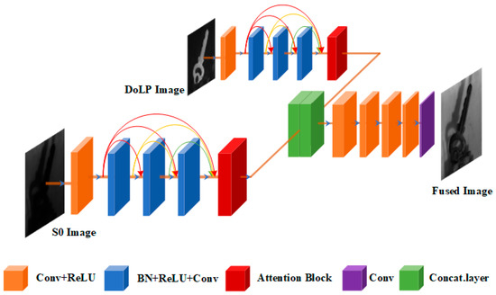 In recent years, deep learning technology has developed rapidly and made great breakthroughs in many problems in the field of computer vision and image processing. At present, there is more and more research on image fusion technology based on deep learning in digital imaging (multifocus image fusion [13], multiple exposure image fusion [14], etc.), multimodal imaging (visible light and infrared image fusion [15], medicine multimodal image fusion [16], polarization image fusion [17], etc.), remote sensing imaging [18] (multispectral and panchromatic image fusion, multispectral and hyperspectral image fusion, etc.), and other directions. Compared with the traditional methods, which have the limited ability to characterize the complex mapping relationship between the input image and the target image, the deep learning model has a strong ability to characterize the complex relationship between different signals. It can automatically extract the most effective features from the data to solve the difficulties of manual design. However, the polarization image fusion method based on deep learning has not been reported so far, which is one of the main contributions of this paper.