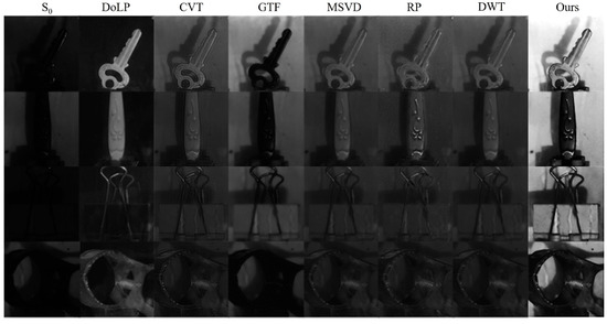 The network training test results are shown in Figure 5. According to the image fusion results, it can be found that the quality of the light intensity image S0 is poor and the scene details are degraded seriously. However, after adding the polarization image for fusion, the target becomes clearer and the texture outline of the key can be clearly identified. According to the image index used for evaluation, the IE and SD after fusion increase by 24.48% and 139%, indicating that the proposed method can improve the quality of underwater images. In addition, the fusion image obtained by this method is compared with several other image fusion methods, including the curvelet transform (CVT) [10], the gradient transfer fusion (GTF) [21], the multiresolution singular value decomposition (MSVD) [22], the ratio of low-pass pyramid (RP) [7], and the discrete wavelet transform (DWT) [8]. As can be seen from Figure 5, the result of RP has poor visual quality. Artifacts are generated to a certain extent on the edge of the key and the shaded part, and there are more noises. The results of CVT, DWT, and MSVD have a certain degree of graininess, and the processing ability of shadows is poor. GTF results have high contrast, but the texture details of the key are not clear enough. However, the method presented in this paper has a relatively real visual effect without obvious artifacts and distortions and has a good processing effect on shadows. To further improve the image-enhancing effect, we also tested different network configurations, but the image quality is not improved much and the corresponding configurations are not valuable. Thus, we choose to only show the current configuration of the network, which already meets the actual requirements.