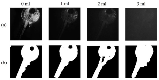 Most of the existing underwater image segmentation algorithms are based on one of the light intensity information, spectral information, and polarization information, which has great limitations. It is necessary to make reasonable comprehensive use of light intensity and polarization information. In the study, we use the improved U-net network to extract features from the fusion image for image segmentation [23,24]. The framework and corresponding configuration of the image segmentation are similar to the image enhancement section of the previous part. We simulated different turbidities underwater by adding different volumes of milk (0, 1, 2, and 3 mL) into the water tank. Figure 6a,b are original images and segmentation results, respectively, at different water turbidities. With the increase in turbidity, the intensity of backscattered light increases, the clarity of the original image decreases, and the noise increases. When the milk volume is 3 mL, the image quality decreases obviously, but the general outline can still be detected in the segmentation results.