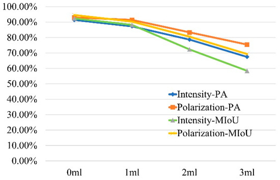 We used pixel accuracy (PA) and mean intersection over union (MIoU) to measure the accuracy of image segmentation. PA represents the ratio of correctly predicted pixels to all pixels in the image. The physical meaning of MIoU is that the overlap of the predicted and labeled region is divided by the combination of the predicted and labeled region. The evaluation index of target segmentation results with different water turbidities is shown in Figure 7. After adding polarization information, PA and MIoU are improved. The results show that the target segmentation based on the proposed method is feasible under turbid water.