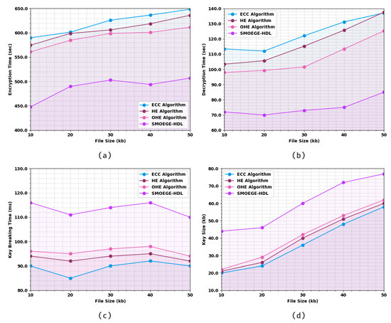 Table 2 and Figure 2 investigate the comparative results offered by the SMOEGE-HDL model with other existing methods. Based on ET and 10 kb file, the SMOEGE-HDL model has attained a lower ET of 448 s, whereas the ECC, HE, and OHE techniques have achieved increased ET of 589.958 s, 574.692 s, and 561.121 s, respectively. Concurrently, based on DT and 10 kb file, the SMOEGE-HDL method has obtained a lower DT of 72 s, whereas the ECC, HE, and OHE techniques have achieved increased DT of 113.433 s, 103.408 s, and 97.940 s, correspondingly. In parallel, based on KBT and 10 kb file, the SMOEGE-HDL model has acquired a lower KBT of 116 ms, whereas the ECC, HE, and OHE approaches have attained increased KBT of 90 ms, 94 ms, and 96 ms, correspondingly. Eventually, based on KS and 10 kb files, the SMOEGE-HDL model has attained lower KS of 44 kb, whereas the ECC, HE, and OHE methods have acquired increased KS of 20 kb, 21 kb, and 22 kb, correspondingly.