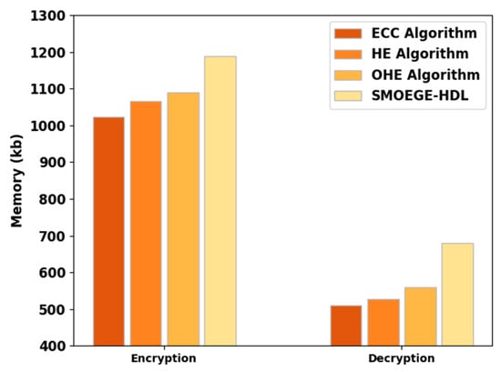 Table 3 and Figure 3 illustrate the EM and DM inspection of the SMOEGE-HDL model with other methods. The results implied that the SMOEGE-HDL model has shown enhanced results with higher EM and DM. For instance, based on EM, the SMOEGE-HDL model has shown enhanced EM of 1188 kb, whereas the ECC, HE, and OHE models have demonstrated reduced EM of 1022.26 kb, 1066.54 kb, and 1088.68 kb, respectively. In addition, based on DM, the SMOEGE-HDL technique has exhibited enhanced DM of 679 kb, whereas the ECC, HE, and OHE algorithms have established reduced DM of 510.294 kb, 526.898 kb, and 560.106 kb, correspondingly.