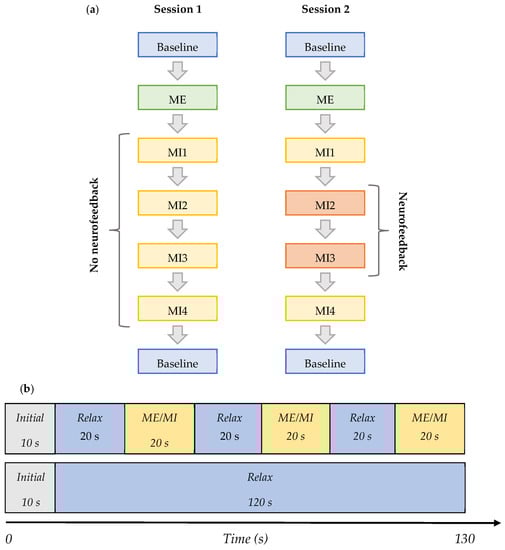 (a) Flowchart of the subsections of sessions 1 and 2. Each ‘Baseline’ block consisted of 2 baselines with eyes open and one with eyes closed. Each ME or MI block consisted of four trials of ME or MI, respectively, as shown in Figure 2. No neurofeedback was received in MI 1-4 during session 1 and in MI 1 and MI4 during session 2. Neurofeedback was provided during MI2 and MI3 of session 2 only. (b) Diagram showing the content of the ME/MI trials and baseline trials—both 130 s total.