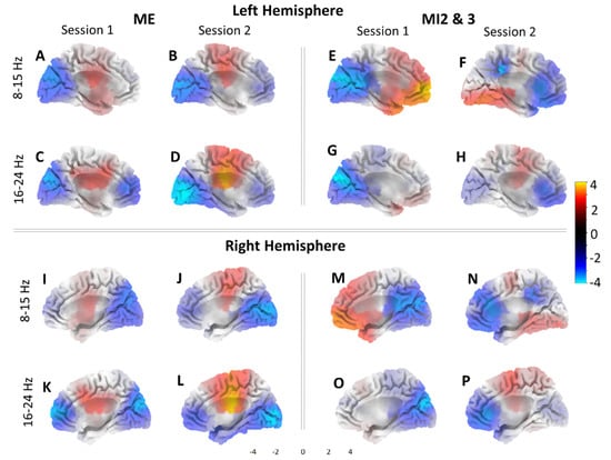 Generally, it can be seen that the cortical activities were similar in patterns in both hemispheres. During ME, there was more activity in the primary sensorimotor cortex in both frequency bands and both sessions with respect to the baseline, while the occipital and frontal areas were more active during the baseline than ME.