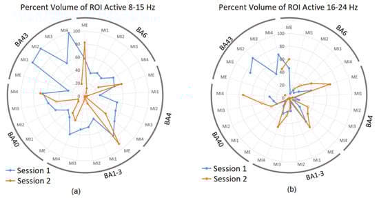 Based on these results, BA 4 representing the primary sensorimotor cortex, BA 6 as the pre-motor, and SMA were selected for more detailed analysis as these areas contain cortical mapping of body parts. In addition, BA 40 and 43 were also included as these areas generally presented a high degree of activity during MI trials in both frequency bands and sessions. The following radar plots show results of this volume analysis, with the percentage of volume of the ROIs active during each of the conditions for Session 1 and 2 during ME and MI1-4. To remind the reader, sub-sessions MI1 and MI4 were performed without neurofeedback in both S1 and S2. Figure 4a shows active volumes in the 8–15 Hz band, while Figure 4b shows active volumes in the 16–24 Hz band.