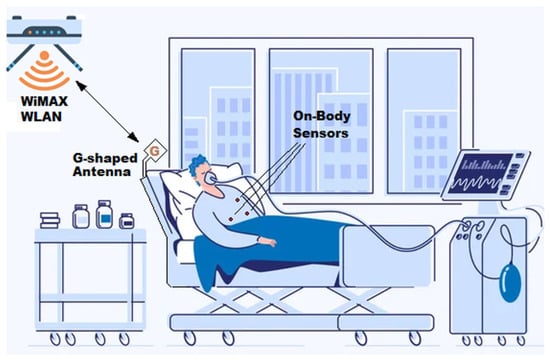 Recently, a lot of research work has been focused on the wideband flexible antennas for biomedical applications [1,2,3,4,5,6,7]. For example, in the application of wireless body area network (WBAN), on-body or implantable biosensors are placed at different positions of the patient body to provide biotelemetry data continuously, at regular time intervals [5,6], or whenever it is required. The biotelemetry data transmitted by the biosensor antennas are collected by a nearby (central) antenna of the WBAN (may be either on-body or off-body antenna). To be available for a wider area network, the central antenna retransmits the collected data to a nearby base station, which is often a WiMAX or Wi-Fi (WLAN) antenna. Figure 1 shows an example of WBAN for a patient in the Intensive Care Unit (ICU) where the G-shaped antenna proposed in the present work is employed as a central off-body antenna to perform the dual function of collecting the biotelemetry data from the biosensors distributed on (or implantable inside) the patient body and then retransmitting them to a WiMAX/WLAN antenna. The minimization of the power consumption is a vital requirement in the biosensor antennas to produce low-power transceivers in biomedical applications, such as the WBAN. To minimize the power required for communication within the nodes of the WBAN, the ultra-wideband (UWB) antennas are preferred to narrowband antennas for their low-power spectral density that is restricted to 41.3 dBm/MHz [8,9]. For this reason, the proposed G-shaped antenna is designed to operate in the “on-body” mode with linear polarization over the wide frequency band (6–19 GHz). In this mode, the central antenna operates with linear polarization to communicate with the biosensor antennas for collecting biotelemetry data. On the other hand, the G-shaped antenna is designed to operate in “off-body” mode for re-transmitting the collected data to the WiMAX/WLAN antenna in the frequency band 5–6 GHz. As shown in Figure 2, the WiMAX/WLAN antenna that may have arbitrary polarization (vertical or horizontal). To reduce the power loss caused by misalignment with the WiMAX/WLAN antenna, the G-shaped antenna is designed to produce circular polarization while operating in the “off-body” mode (5–6 GHz) and linear polarization while operating in the “on-body” mode (6–19 GHz).