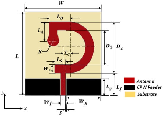 Both the G-shaped and inverted G-shaped antennas can be viewed as composed of semicircular strip connected, at its upper end, to horizontal strip extension of length L followed by vertical strip extension of length L to form a right-angle corner-shaped extension that is terminated by a small circular patch of radius R. At its lower end, the semicircular strip is terminated with a horizontal strip extension of length L and width W, as shown in Figure 3. The semicircular strip can be described by the inner and outer diameters D and D, respectively. The antenna is excited through a CPW feeding line. The CPW has a length of L, the width of its central strip is W, and the width of each side slot is S. The characteristic impedance of the CPW is obtained based on W and S that are calculated using the CPW design equations [44,45]. The length of the CPW central strip extension to connect the antenna to the feed line is L. The antenna and the CPW feeder are printed on a flexible Rogers RO3003 substrate which has a dielectric constant , and thickness mm. The total size of the printed antenna is . The best dimensions of the proposed antenna are shown in Table 2.