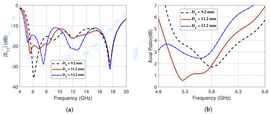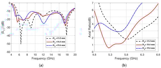 The effects of changing the outer and inner diameters, D and D, respectively, are depicted in the present section. The effects of changing the outer diameters D on and the AR is shown in Figure 5. It is evident in Figure 5a that increasing D leads to a decrease in the lower and higher frequency bands and the entire impedance matching band is shifted towards the left. However, Figure 5b shows that the best performance regarding the 3dB-AR bandwidth is achieved when D = 16.6 mm.
