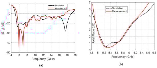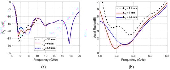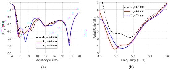 The impact of altering the length L of the CPW central strip extension on the magnitude of the reflection coefficient, , and the AR over the applicable frequency ranges are shown in Figure 10. Figure 10a shows that the lower frequency of the impedance matching bandwidth slightly decreases with increasing L. However, the widest bandwidth is obtained by setting L = 7.2 mm. This value of L results in a 3dB-AR frequency range covering 5 GHz to 6 GHz as shown in Figure 10b.