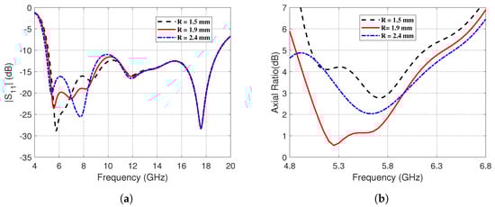 The impact of altering the radius, R, of the circular patch termination on (a) The reflection coefficient magnitude, , over the frequency range (4–20 GHz). (b) The AR over the frequency range (4.8–6.8 GHz).