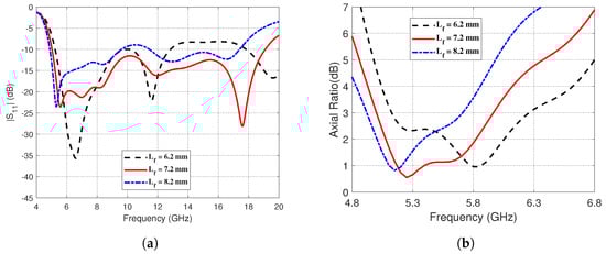 The impact of altering the length, L, of the central strip extension on (a) The reflection coefficient magnitude, , over the frequency range (4–20 GHz). (b) The AR as a function of frequency (4.8–6.8 GHz).