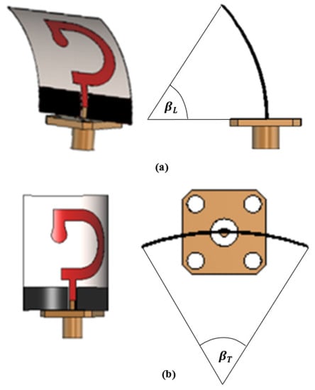 The proposed antenna subjected to bend stresses in (a) The longitudinal plane, (b) The transverse plane.