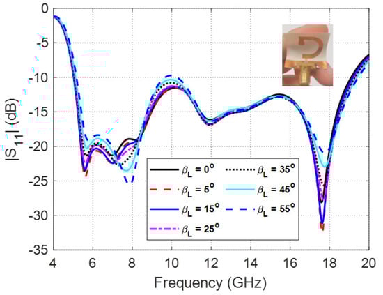 The frequency dependence of the reflection coefficient, , for different values of the longitudinal bend angle, is presented in Figure 12. It is shown that for longitudinal bend angles less than , the dependence of on the frequency is almost unchanged keeping the impedance matching bandwidth almost the same for . However, for , the value of starts to increase above −10 dB leading to decrease the impedance matching bandwidth.