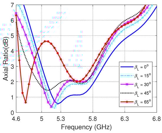The effects of changing the vertical and horizontal dimensions, L and L, respectively, of the corner-shaped extension of the curved strip on the reflection coefficient magnitude and the AR are investigated in the present section. The effects of changing vertical length, L, on the frequency response of the reflection coefficient magnitude, , and the AR are presented in Figure 7, respectively. It is shown in Figure 7a that the impedance matching frequency band seems to be slightly affected at its lower frequency by changing L. On the other hand, the AR seems to be strongly dependent on L, as shown in Figure 7b. It is clear that setting L = 6 mm gives the best 3dB-AR bandwidth.