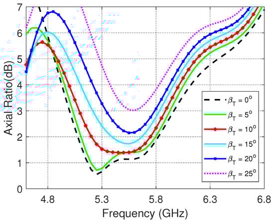 The frequency dependence of the axial ratio for different values of the longitudinal bend angle, is presented in Figure 13. It is shown that, with increasing the frequency band for 3dB-AR is slightly shifted towards the left keeping the 3dB-AR bandwidth almost unchanged keeping the impedance matching bandwidth almost the same for . However, for , the value of the axial ratio increases above 3 dB leading to lose the circular polarization over a significant part of the frequency band.