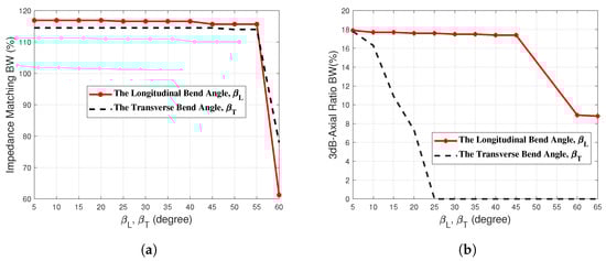 Dependence of the percentage (a) impedance matching bandwidth and (b) 3dB-AR bandwidth on the bend angles, and .