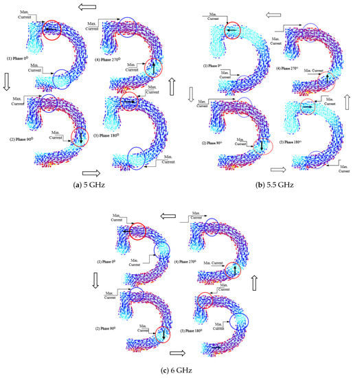The way that the proposed inverted G-shaped strip antenna produces circular polarization can be demonstrated by showing the surface current distribution on the semi-circle strip radiator, as depicted in Figure 17. The surface current distributions are presented at sequential orthogonal phases , , , and which correspond to time delays 0, , , and , respectively, where T is the periodic time at different frequencies, such as 5, 5.5, and 6 GHz.