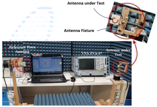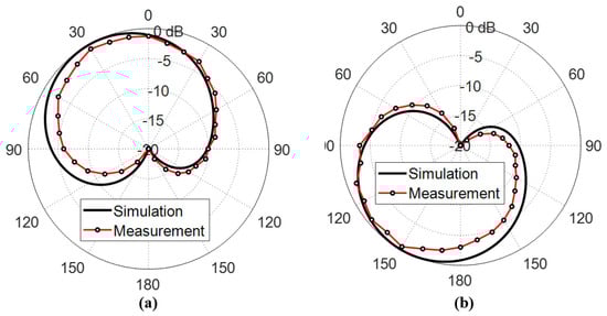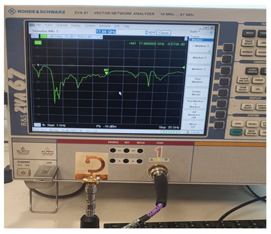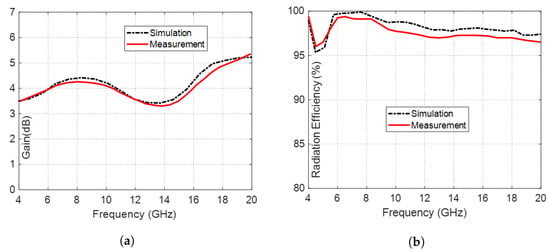 The results of the simulation and experimental testing of the radiation efficiency of the inverted G-shaped antenna, which were conducted over the frequency range of (4–20 GHz), are presented in Figure 22b and demonstrate good agreement. Owing to the coplanar structure and the high quality and small thickness of the substrate material, the radiation efficiency is maintained above over almost the entire frequency band of operation (5–19 GHz).