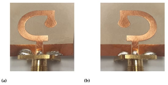 The flexibility of a circularly polarized (CP) antenna’s substrate can significantly impact its performance [35]. When the antenna is bent or deformed, the polarization purity of the transmitted and received signals can be affected, resulting in a decrease in antenna efficiency and signal quality. However, using a flexible substrate in the design of CP antennas can help mitigate these issues by allowing the antenna to conform to curved or irregular surfaces, reducing the impact of substrate deformation on antenna performance [36,37]. In recent years, there has been a growing interest in designing circularly polarized antennas using flexible substrates to improve their performance under bending conditions. Flexible substrates can conform to curved or irregular surfaces and provide better integration with conformal devices, making them ideal for use in wearable or flexible communication systems [38]. The use of flexible substrates in circularly polarized antennas has been shown to improve radiation performance under bending conditions and reduce the impact of substrate deformation on antenna performance [39,40]. This makes them particularly useful for applications such as smart textiles and Internet of Things (IoT) devices, where antennas need to be compact, low-profile, and able to withstand deformation. As such, research into the design of circularly polarized antennas using flexible substrates has become an active area of investigation in the field of wireless communication technology [41,42,43].