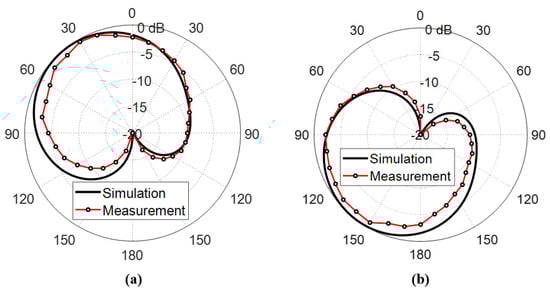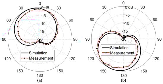 Radiation patterns of (a) RHCP and (b) LHCP fields produced by the inverted G-shaped antenna in the plane at the 5.5 GHz.