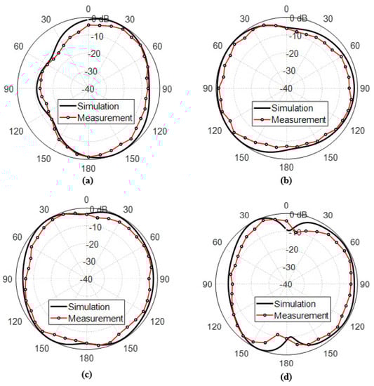 The measured far field radiation patterns of the total electric field (Linearly Polarized) produced by the inverted G-shaped in the plane at 9, 12, 15, and 18 GHz, respectively, as shown in Figure 26. The measured and the simulated radiation patterns of the total radiated field at multiple frequencies over the frequency range 6–19 GHz show good agreement.