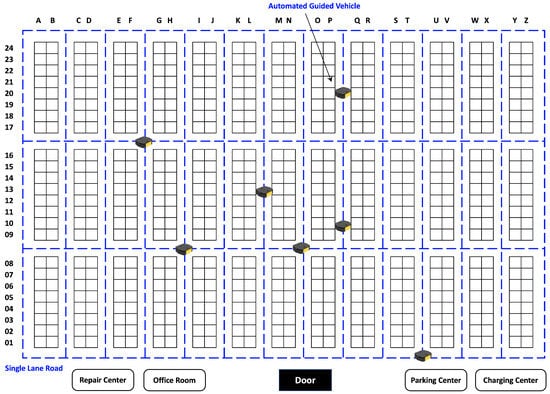 The AGVs were programmed to stop at the park center when no tasks were assigned. Additionally, there were designated halt positions, such as A02 and B12, where the AGVs could temporarily pause while processing an order. There were three types of goods in this warehouse: delivered goods, transported goods, and relocated goods. Delivered goods were loaded at the door and unloaded at another position, whereas transported goods were moved from a specific rack to the door, and relocated goods were transferred from one rack to another. These tasks were challenging, as the AGVs had to navigate through the warehouse while avoiding obstacles, as shown in Figure 3.