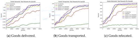 Figure 4 illustrates the convergence of the reward function in route selection based on the Q-learning technique. The function showed a gradual rise and eventual stabilization to a final state as the number of episodes increased. However, both the native multi-agent deep deterministic policy gradient (MADDPG) and -greedy MADDPG techniques converged more quickly to the steady state. When comparing the two MADDPG techniques, the -greedy strategy yielded better benefits. In the MADDPG algorithm, an value of 0.1 provided superior results to values of 0.01 and 0.05. This finding was consistent with most simulations of the -greedy approach, which demonstrated that an optimal value was attained around . However, determining the ideal value of for the current AGV environment requires further investigation.