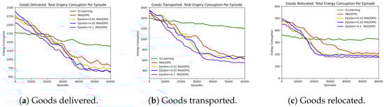 In this article, we used the AGV’s energy consumption per second as a unit, the AGV’s total energy once it arrived at its destination as an indicator, and the total energy of all AGV vehicles, as indicated in Figure 5. From this, it is clear that the route planned by Q-learning used a significant amount of energy, followed by the route planned by the primeval MADDPG algorithm and the route planned by the -greedy MADDPG algorithm, which used the least amount of energy.