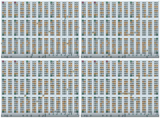 The path of the AGV is shown in Figure 6. The shelves’ green tint indicates that they can hold stock. The shelf’s yellow tint shows that there is merchandise there. The shelves’ crimson tint indicates that they are completely full. When an AGV is in transit, it is shown by a yellow AGV, and when it is idle, it is indicated by a green AGV. From the figure, we can see that due to route conflicts, the AGV transporting items stopped for a period of time in the middle so that the transport AGV could pass smoothly. At the same time, some AGVs chose another path to avoid route conflicts.