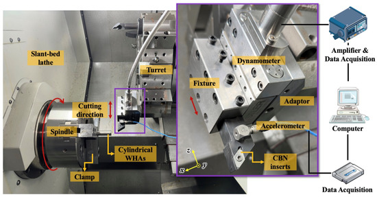 Figure 1 shows the experimental equipment and sensor system used in this study. A cylindrical WHA workpiece in combination was carried out on a slant-bed lathe (Hison, HTC150, Ningbo, China) without cutting fluids. A dynamometer (Kistler, 9119AA2, Winterthur, Switzerland), together with an A/D data acquisition board (Kistler, 5697A, Switzerland), was mounted on the turret of the lathe via an adaptor to capture the cutting forces at a sampling frequency of 5 kHz per channel. The integrated electronic piezo-electric (IEPE) triaxial accelerometer (Kistler, 8763B, Switzerland), connected with data acquisition (National Instruments, Austin, TX, USA), was glued on a tool holder as close to the insert as possible to better measure the vibration generated in the cutting area, with a sampling rate of 5 kHz.