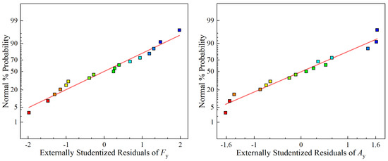 Table 5 reveals that the F-value of the model is 289.12, indicating that the established model is significant, and there is only a 0.01% probability that such a large F-value is due to noise. The model terms , , , , and are significant, as a p-value less than 0.05 indicates. The value and adjusted- value of the model are 99.30% and 99.39%, respectively, and the difference between the two is negligible, demonstrating that the established polynomial can fully reflect the relationship between the design variable and the response. Based on the ANOVA results, all of the constructed regression models can be used to quantify the relationship between process factors and corresponding responses.