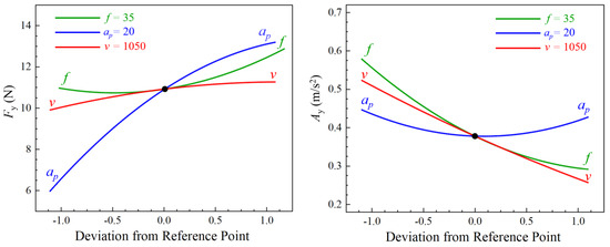 Figure 3 displays the normal probability plot of the and residuals. The plot indicates that the majority of the residuals are closely clustered around the straight reference line, signifying a normal distribution. This suggests that both regression models are well fitted. Figure 4 depicts a perturbation plot that shows the effect of the three factors on and . This plot is a valuable graphical tool for comparing the effects of all of the factors at a particular point in the design space. The results indicate that the cutting depth significantly influences the cutting force, whereas the feed rate has the least effect. In terms of vibration, both cutting speed and feed rate have the most significant influence, while the cutting depth has the least effect.