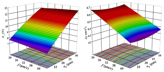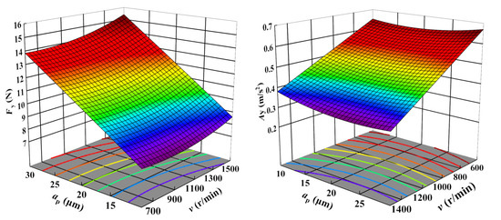 A total of 17 experiments were designed using the Box–Behnken design (BBD), and the parameters and results of each experiment are provided in Table 3. It can be seen from Table 3 that the surface roughness of the processed workpiece will decrease with the increase in cutting force and vibration. Therefore, in order to obtain better surface quality, the cutting parameters should be optimized with the optimization goal of reducing cutting force and vibration.