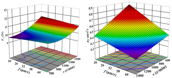 Figure 5, Figure 6 and Figure 7 display the 3D contour plots illustrating the impact of cutting parameters on cutting force and vibration. Each plot represents the impact of two process variables, with all variables taking values within the experimental study range, while the other variable is fixed at the center point value. The experimental results demonstrate that the cutting force is most significantly affected by the depth of cut, followed by the cutting speed, while the feed rate has the least effect. As the depth of cut and cutting speed decrease, the cutting force also decreases. Concerning vibration, the cutting speed is the parameter with the most significant impact, followed by the feed rate, while the depth of cut has the least influence. The vibration tends to decrease with increased cutting speed and feed rate.