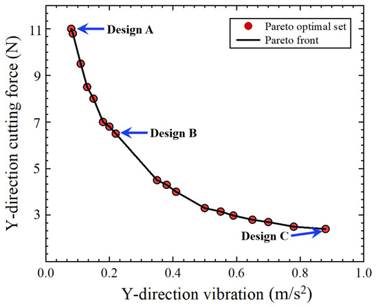 The goal of the NSDOB optimization algorithm is to minimize the y-direction force and vibration during the cutting process of WHAs. The 1 and −1 levels of the experimental input parameters cutting speed, feed rate, and depth of cut are used as the initial population generation range of the genetic algorithm. The optimization algorithm uses a population size of 18, and the ratio of the ball-rolling dung beetle, the brood ball, the small dung beetle, and the thief beetle in the population is 1:1:1:1. The maximum number of iterations is set to 200 to ensure that the algorithm runs to completion. The optimized Pareto front obtained after 87 algorithm iterations is shown in Figure 8.