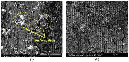 In order to verify the feasibility of the NSDBO algorithm, the turning experiment was carried out again using the optimized parameters, and the experimental conditions were the same as the orthogonal experimental conditions mentioned above. After the test, the surface morphology of the workpiece was observed using a scanning electron microscope. Figure 9 is a comparison of the surface morphology before and after optimization. The surface processed using the parameters before optimization is shown in Figure 9a, and the surface damage caused by incomplete material removal can be clearly seen. The surface processed with the optimized parameters is shown in Figure 9b. In contrast, regular knife lines were obtained without obvious damage on the surface, and the surface quality significantly improved.