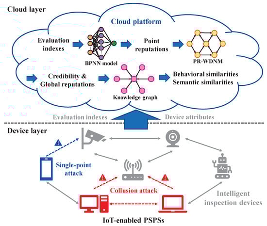 (2) Cloud Layer: The cloud layer comprises a centralized cloud server that provides sufficient computing and storage resources for reputation evaluation and behavioral analysis in IoT-enabled PSPSs. It utilizes a BPNN model to obtain point reputations of mutual evaluations between devices. These point reputations are then aggregated using our PR-WDNM to obtain each device’s credibility and global reputation, assisting the administrator in detecting single-point attacks within IoT-enabled PSPSs. Furthermore, the cloud platform constructs a knowledge graph by incorporating device attributes, interaction relationships, and reputations. This knowledge graph can assist the administrator in calculating behavioral and semantic similarities between devices for collusion attack detection.