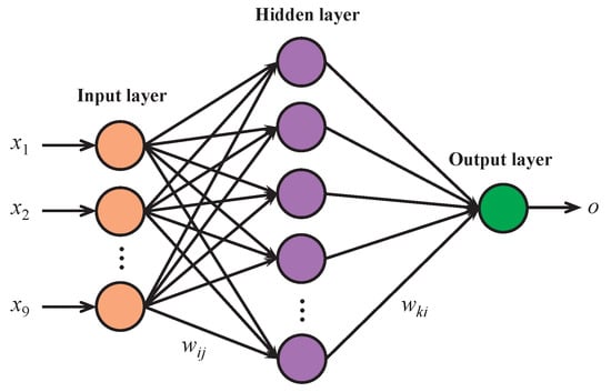 (1) Initialization: We denote the connection weight from input layer neuron j to hidden layer neuron i as . The threshold at hidden layer neuron i is denoted by , and the activation function at the hidden layer is denoted by . Moreover, we denote the connection weight from hidden layer neuron i to output layer neuron o as . The threshold at output layer neuron o is denoted by , and the activation function at the output layer is denoted by . In the initialization process,  and  are assigned random values,  and  are set to 0, and a learning rate  is specified. The total number of training iterations is also set to a fixed value to ensure the network can terminate training.