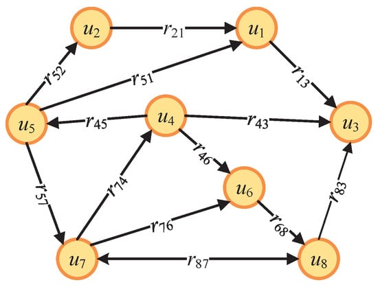As shown in Figure 3, our PR-WDNM can be denoted by a triple , where  denotes the set of all intelligent inspection devices in an IoT-enabled PSPS,  denotes the set of point reputation evaluation relationships, and R denotes the weight matrix of directed edges. Moreover,  denotes a weighted directed edge from  to , and  denotes the weight of , which is equal to the point reputation value evaluated by  to . By performing this, we visually illustrate the point reputation evaluation relationships between devices. Moreover, the statistical properties in PR-WDNM include the evaluation relationships between devices, point reputation values of each device, average point reputation values of all devices, as well as the sets of evaluator devices and evaluatee devices. They will be utilized in the credibility and global reputation calculations to detect malicious devices that launch single-point attacks.
