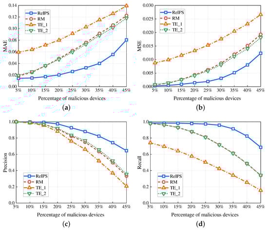 Figure 4 plots the four performance metrics for different methods versus the percentage of malicious devices, with a fixed total number of 100 devices. As depicted in Figure 4a,b, our ReIPS achieves lower MAE and MSE compared to the benchmarks. For example, when the percentage of malicious devices is 30%, the MAE of our ReIPS is 42.96% for RM, 30.7% for TE_1, and 44.62% for TE_2, whereas the MSE of our ReIPS is 35.57% for RM, 17.43% for TE_1, and 38.09% for TE_2 This can be attributed to our ReIPS calculating the device credibility based on point reputations and using it as the weight of point reputation for global reputation aggregation. Specifically, the point reputation evaluated by a normal device carries a larger weight, whereas the point reputation evaluated by an abnormal node carries a smaller weight or even 0. Consequently, our ReIPS improves the reliability of the global reputation evaluation results. Figure 4c,d demonstrate that our ReIPS outperforms the benchmarks in precision and recall. When the percentage of malicious devices is 30%, the precision of our ReIPS is 0.13, 0.12, and 0.11 higher than that of RM, TE_1, and TE_2, respectively, and the recall of our ReIPS is 0.24, 0.54 and 0.24 higher than that of RM, TE_1, and TE_2, respectively. This is because our proposed PR-WDNM can identify the malicious devices launching single-point attacks and filter out their false point reputations, thereby removing their impact on the global reputation calculation.