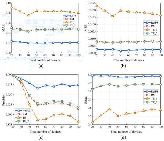 Performance in different methods versus the total number of devices. (a) MAE. (b) MSE. (c) Precision. (d) Recall.