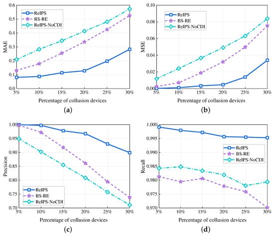 Performance in different methods versus the percentage of collusion devices. (a) MAE. (b) MSE. (c) Precision. (d) Recall.