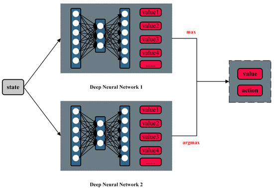 The DQN network’s greedy strategy and the interference of noise can lead to overestimation in the model. Compared to using the same network for both maximum value judgment and estimated value calculation, Hado van Hasselt et al. [18] proposed the DDQN network (shown in Figure 5), which introduces an additional network to decouple selection from the calculation, effectively addressing overestimation issues caused by DQN.