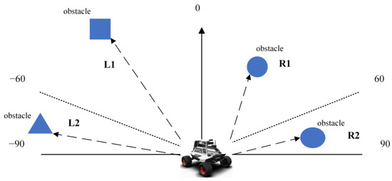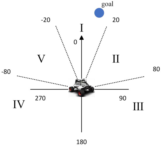 If unprocessed sensor-generated data are input into the network during training, it may result in issues such as slow training and challenge model convergence due to high data dimensionality, significant data correlation and increased data redundancy. The target locations associated with the robot’s forward direction were categorized into five intervals: [−20, 20), [20, 80), [80, 180), [180, −80) and [−80, −20) as shown in Table 1 and Figure 6. In the obstacle avoidance section, we only considered obstacles located within the robot’s forward direction between [–90, 90] degrees and divided them into four quadrants based on a 180 degree range, obtaining the positional information of each part from the nearest obstacle (we only consider the information of the closest obstacle), as illustrated in Figure 7. Meanwhile, the robot’s continuous operation was partitioned into five states, significantly reducing computational complexity and adhering to the robot’s movement rule as presented in Table 2.