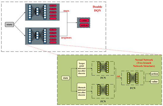 Imitating the design of DDQN, we designed a dual branch network structure on the basis of it to decouple obstacle avoidance and navigation, in which obstacle relative position and discrete target point relative position were respectively fed into the navigation module and obstacle avoidance module of the network. In the dual-branch network structure, we partitioned data into the obstacle avoidance module and the navigation module. The former requires obstacle information while the latter necessitates relative target point position. We input the four discrete values of the four distinct regions into the obstacle avoidance module and input the three parameters (the distance from the robot to the target point, its steering angle and target point position) into the navigation module. The inputs were then fed into a fully connected neural network, which generated 64 dimensions per network and a total of 128 dimensions when combined. The two-branch network was integrated separately into the fully connected neural network (FCN), and subsequently, the model output estimations for each action, as illustrated in Figure 8.