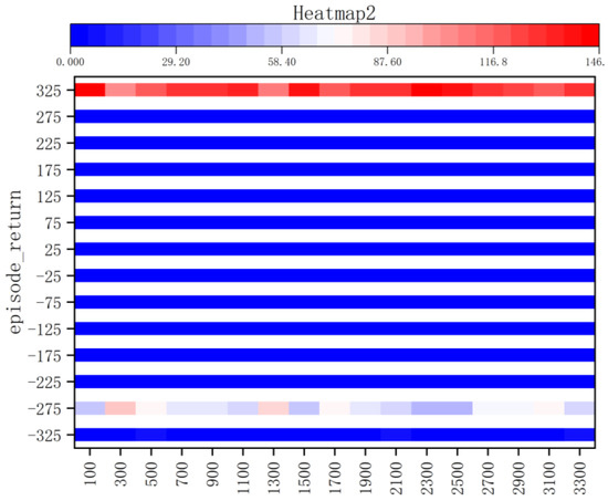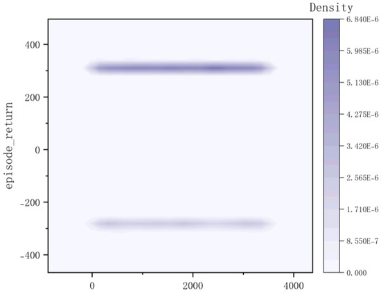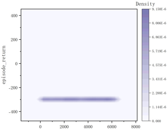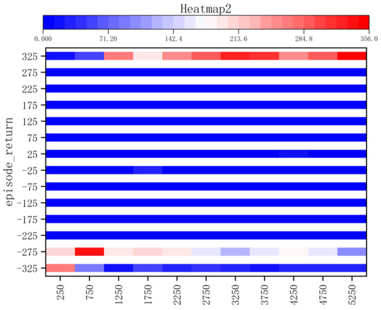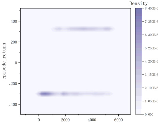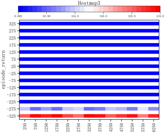 According to the kernel density graph in Figure 12 and the bar heat map in Figure 13, it is evident that a majority of reward values are concentrated around −300 with only a handful successfully reaching the target point, indicating an unfavorable outcome of training. The training process is notably marked by slow convergence and vulnerability to local optima, leading to extended model training duration.