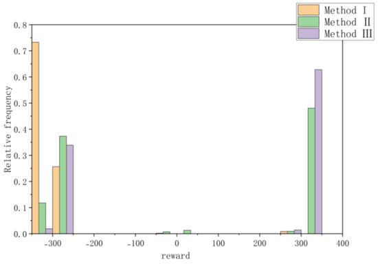 Moreover, all three methods are compared in terms of data distribution histograms and numerical analysis, respectively. Figure 20 compares the reward level distributions for the three techniques. Compared to Method I, the reward values of Method II and Method III exhibit a higher degree of concentration around +300. Moreover, when compared to Method II, Method III exhibits a higher tendency to receive rewards valued at +300, resulting in a reward value distribution that is more closely aligned with this particular value.