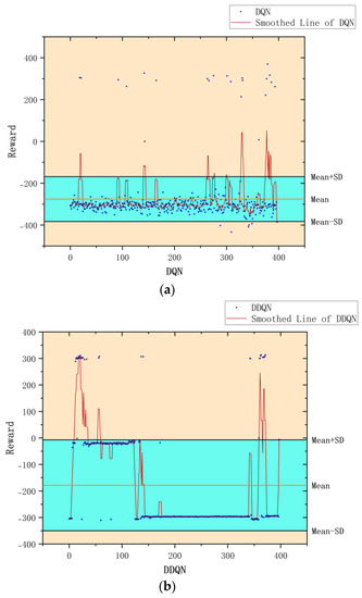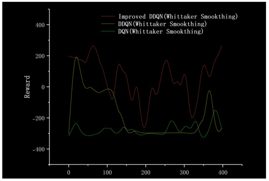 In order to further verify the advantages of the improved algorithm proposed in this paper in the training process, this paper uses DQN, DDQN, and Improvement DDQN (Method III) for training under the same environment and analyzes the reward value obtained in each round, as shown in Figure 21 (using Whittaker Smoother fitting to create a smoother curve). We can see that the improved algorithm proposed in this paper results in more positive rewards in the training stage and higher overall rewards than the other two algorithms, as shown in Figure 22.