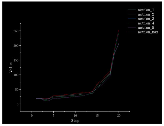 In order to verify the feasibility of the improved algorithm and briefly analyze its interpretability, we used Method III to conduct a complete path planning process in the simulation environment and recorded the Q values of the actions that could be taken in each step, as shown in Figure 23. It can be seen that in the early stage of path planning, due to the farther distance from the target point, each Q value was relatively low. With the progress of the path finding process, at five steps and 13 steps, the overall reward is low due to the existence of obstacles around the robot, indicating that there may be dangers. Finally, after 20 steps, the target point is approaching, and the reward value becomes larger and larger until the target point is reached. The arrival of the target point will obtain a +300 reward; thus, it can be seen that taking different actions at the upcoming target point makes a big difference in the reward value.