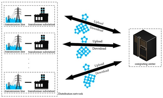 In this paper, the centralized model obtained by the training of the overall dataset was used as the baseline of this research [24]; that is, the global model was obtained by using the overall dataset for training without splitting the local dataset. This scheme simulates the process of uploading all the insulator image data of each substation to the computing center and performing unified training in the computing center to obtain a global model trained by all insulator datasets, and then sending this model back to each substation for fault detection. This process is illustrated in Figure 2.